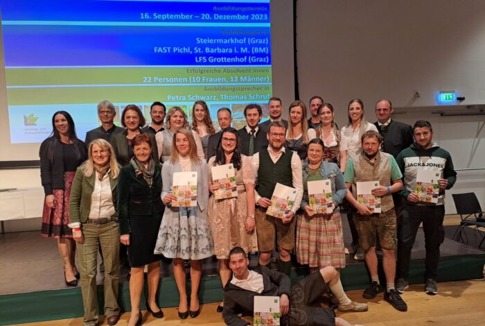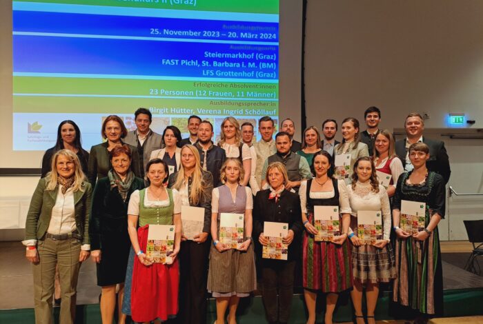 Von Mitte September 2023 bis Ende März 2024 organisierte die Lehrlings- und Fachausbildungsstelle der Landwirtschaftskammer im Steiermarkhof in Graz vier Facharbeiter:innen-Ausbildungen in der Sparte Landwirtschaft. Die frisch geprüften Facharbeiter:innen absolvierten diese 230-stündige fachlich fundierte Ausbildung, die auf eine mehrjährige praktische Erfahrung aufbaut, im zweiten Bildungsweg. Am Ende der Ausbildung legten die Kandidat:innen die Abschlussprüfungen in den landwirtschaftlichen Fächern „Pflanzenbau“, „Tierhaltung“, „Landtechnik“, „Forstwirtschaft“ sowie „Betriebsführung“ ab. Die Kandidat:innen konnten sämtliche Prüfungen erfolgreich ablegen und dürfen sich nun über ihren landwirtschaftlichen Berufsabschluss freuen. Neben den Ehrengästen zeigte sich LFA Geschäftsführer Franz Heuberger von den Leistungen der frisch geprüften Facharbeiter:innen erfreut. Schließlich schafften es 33 Absolvent:innen die Ausbildung mit einem Notenschnitt von 1,0 abzuschließen.